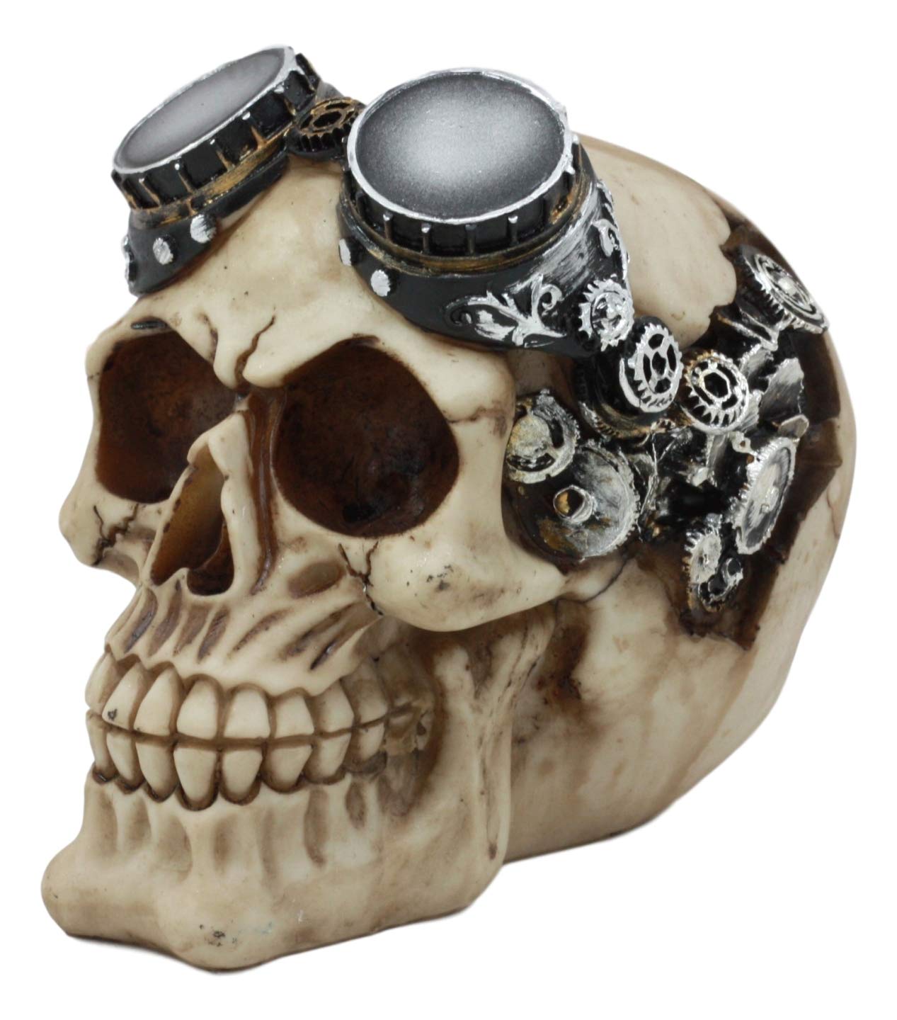 Each inch of this skull is a testament to our artists’ craft. The aviator steampunk skull combines the Sci-Fi Steampunk element with the Macabre themed skull. The gears painted and sculpted into the skull elevates the look with a cyborg robotic design.