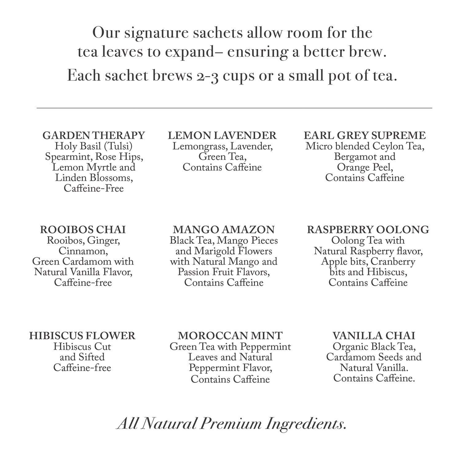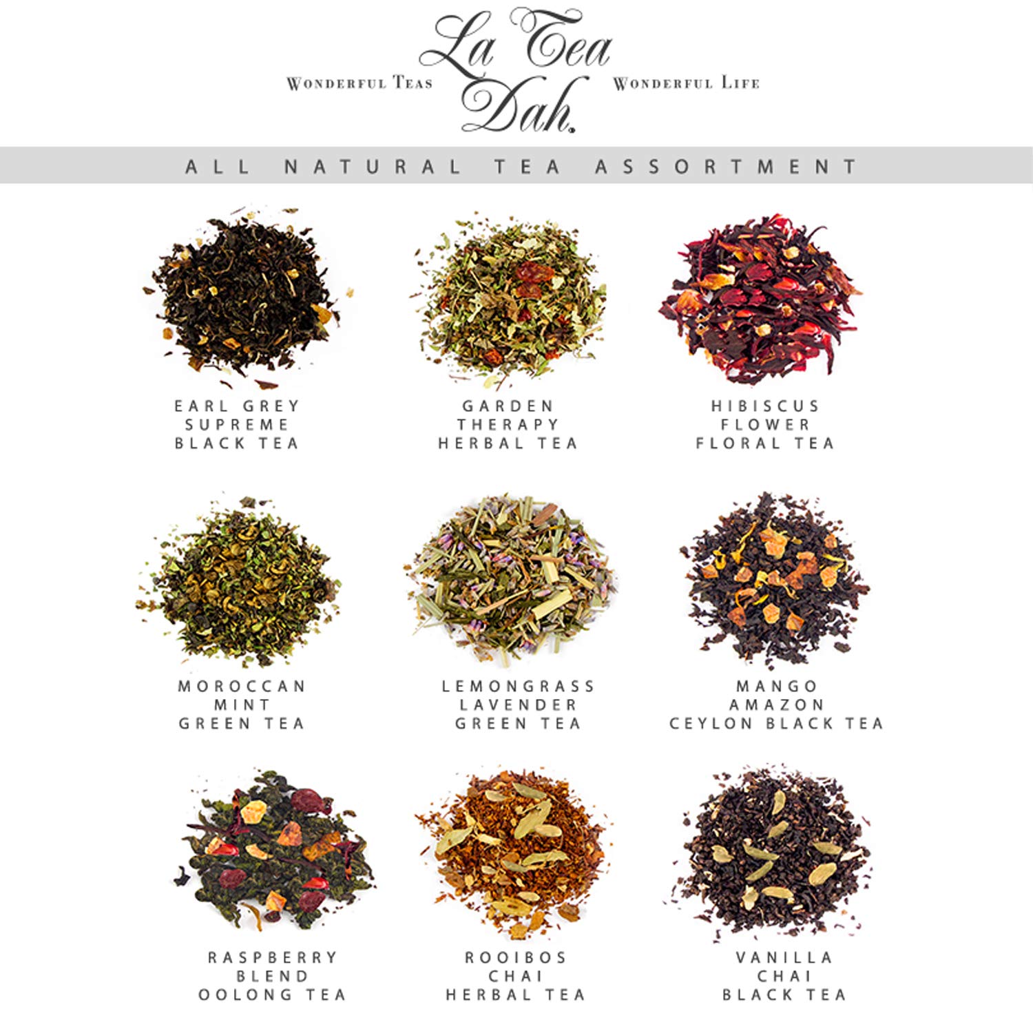 EVERY TEA LOVER’S FAVORITE FLAVOR: Nine assorted natural teas bursting with flavor suit each and every tea lover’s palate. Black Teas: Earl Grey, Vanilla Chai Green Teas: Moroccan Mint, Lemon Lavender Oolong Teas: Raspberry Oolong Herbal Blend Teas: Day by day DeTox, Hibiscus Flower, Rooibos Chai