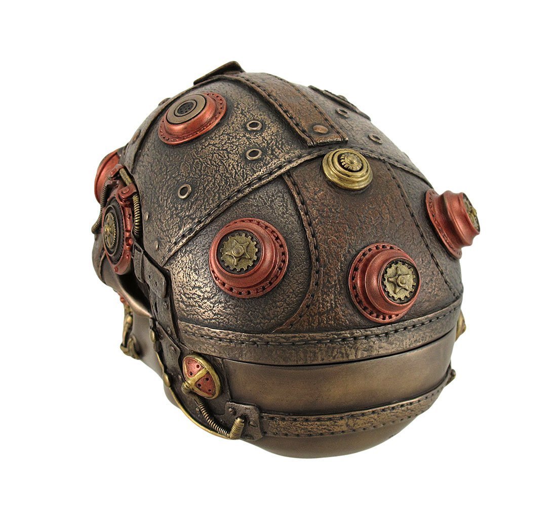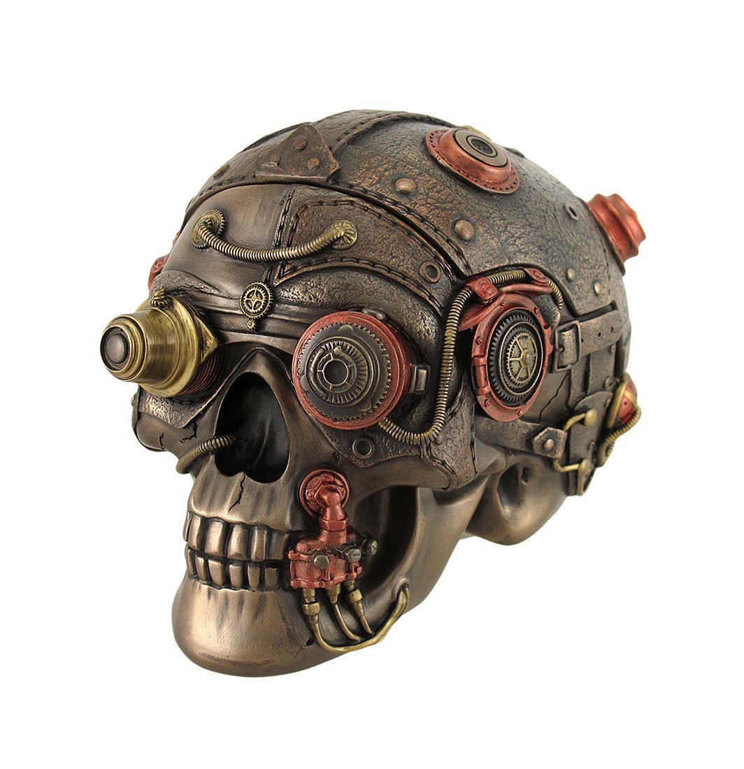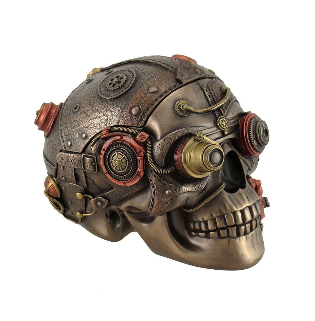 Steampunk is a subgenre of science fiction that contains technology and aesthetic designs impressed by the 19th century industrial steam-powered machinery. This 6 inch long, 4.5 inch wide, 5 inch Top (15 X 11 X 13 cm) steampunk impressed skull trinket box is easily crafted of Solid resin with a leather like texture, a metallic bronze End and copper and brass colored gears and accessories. It is a great place to contain your mysteries and treasures, and makes a grand gift for both skull collectors and steampunk enthusiasts certain to be enjoyed.