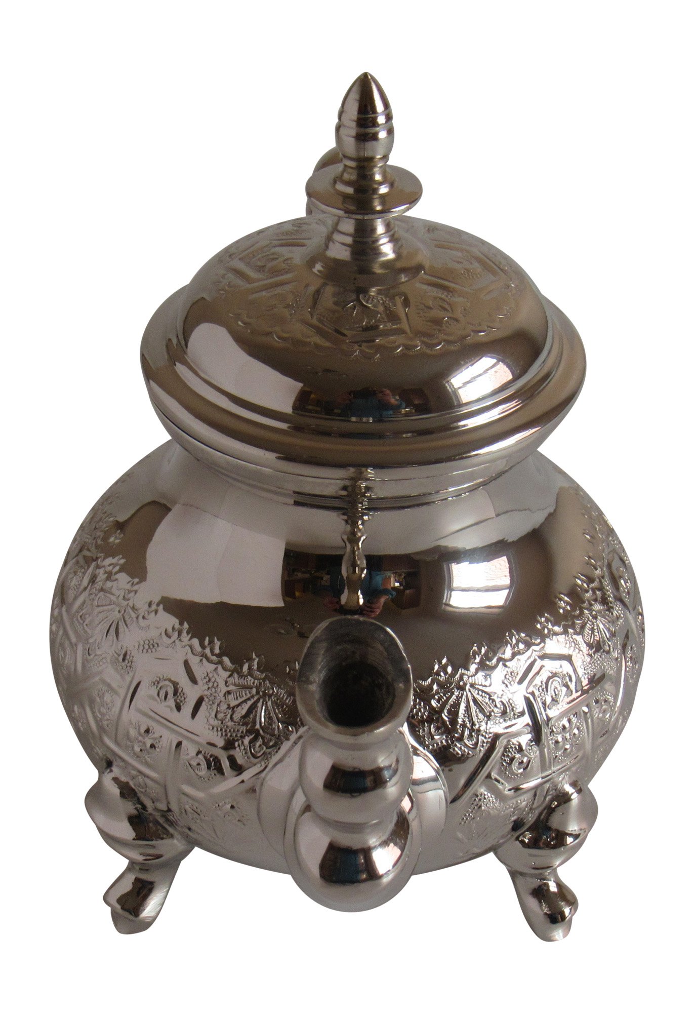 Bring this stunning silver Moroccan style teapot into your home and fall in love with its mystique, its beauty and its functionality. Handmade in Fez, the old imperial capital of Morocco located just northeast of the Atlas Mountains, by artisanal silversmiths the use of traditional methods and materials. With a built-in tea infuser filter and a 34oz capacity, this tea kettle is the perfect size for serving at a dinner party or casual get in conjunction with friends. The intricate hand embossed design motif accentuates any room in your house, creating a warm and inviting presence with a hint of Moroccan flair. Pair it with the traditional clear glasses and set it next to your tagine, or integrate it into your grandmother’s china – this teapot is really versatile for any décor.